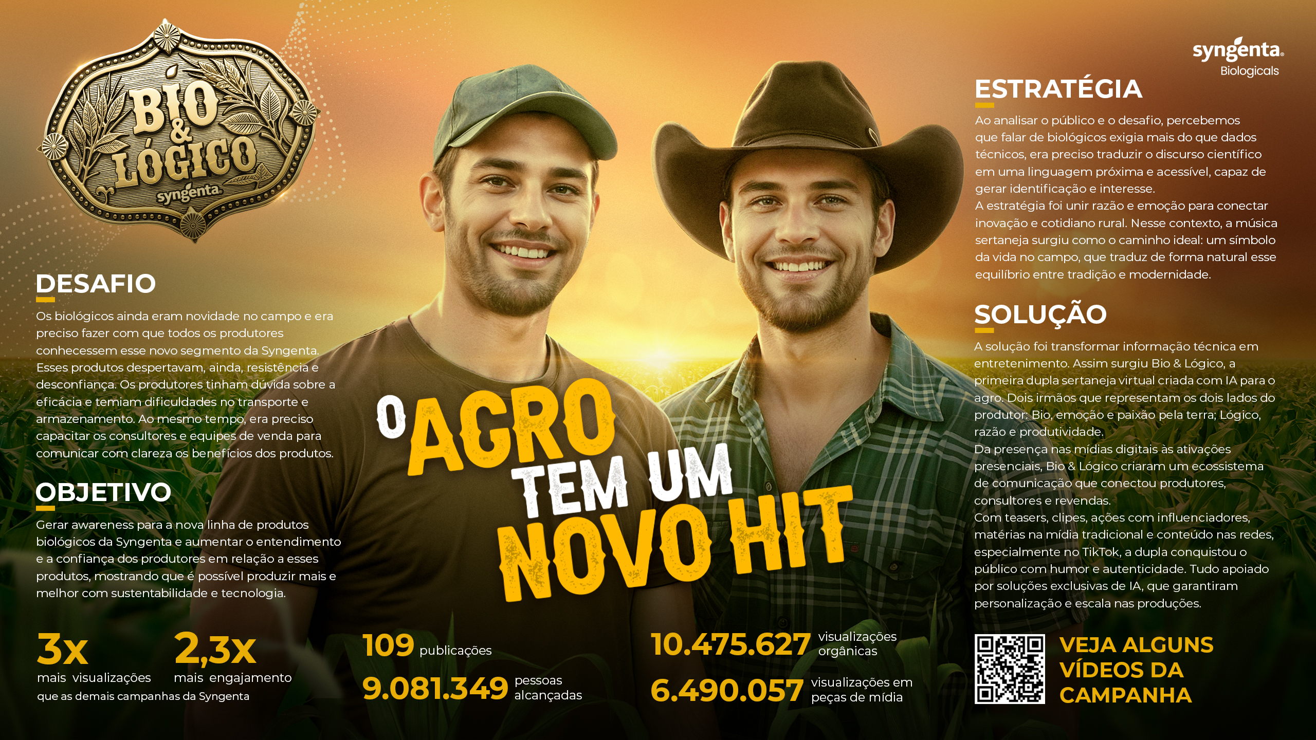 A campanha Bio & Lógico superou todas as expectativas de alcance, engajamento e impacto, tornando-se um dos maiores sucessos de comunicação da Syngenta nos últimos anos. Desde o lançamento, a ação se consolidou como um divisor de águas na forma de comunicar inovação no agronegócio, transformando um tema técnico — os produtos biológicos — em um fenômeno cultural entre produtores, consultores e revendas. Os resultados comprovam a força da estratégia. A campanha alcançou mais de 9 milhões de pessoas, gerando 10.475.627 visualizações orgânicas e 6.490.057 visualizações em peças de mídia, somando um alcance total superior a 16 milhões de exibições. Foram 109 publicações distribuídas entre redes sociais, portais e ativações digitais, com desempenho 3 vezes maior em visualizações e 2,3 vezes superior em engajamento quando comparado às demais campanhas da Syngenta no mesmo período. Além dos números expressivos, a campanha construiu um legado de relacionamento e reputação. O projeto produziu 90 vídeos, 40 peças estáticas, 17 músicas e videoclipes originais e 13 matérias no portal Mais Agro, consolidando um ecossistema de conteúdo vivo e multiplataforma que manteve a marca presente de forma contínua durante todo o ciclo de comunicação. Nas redes sociais, especialmente no TikTok, Bio & Lógico conquistaram o público com vídeos curtos, trends e conteúdos de humor, ampliando a presença digital da Syngenta entre produtores e novas gerações do agro. Em paralelo, as ações de endomarketing e eventos presenciais — como as ativações no Acessa Agro e em feiras do setor — fortaleceram o engajamento interno e o orgulho dos colaboradores. Mais do que uma campanha, Bio & Lógico se tornaram símbolo de inovação, proximidade e autenticidade. A iniciativa posicionou a Syngenta como referência em comunicação digital no agronegócio, provando que a tecnologia pode emocionar, educar e gerar resultados concretos quando usada com propósito e criatividade.