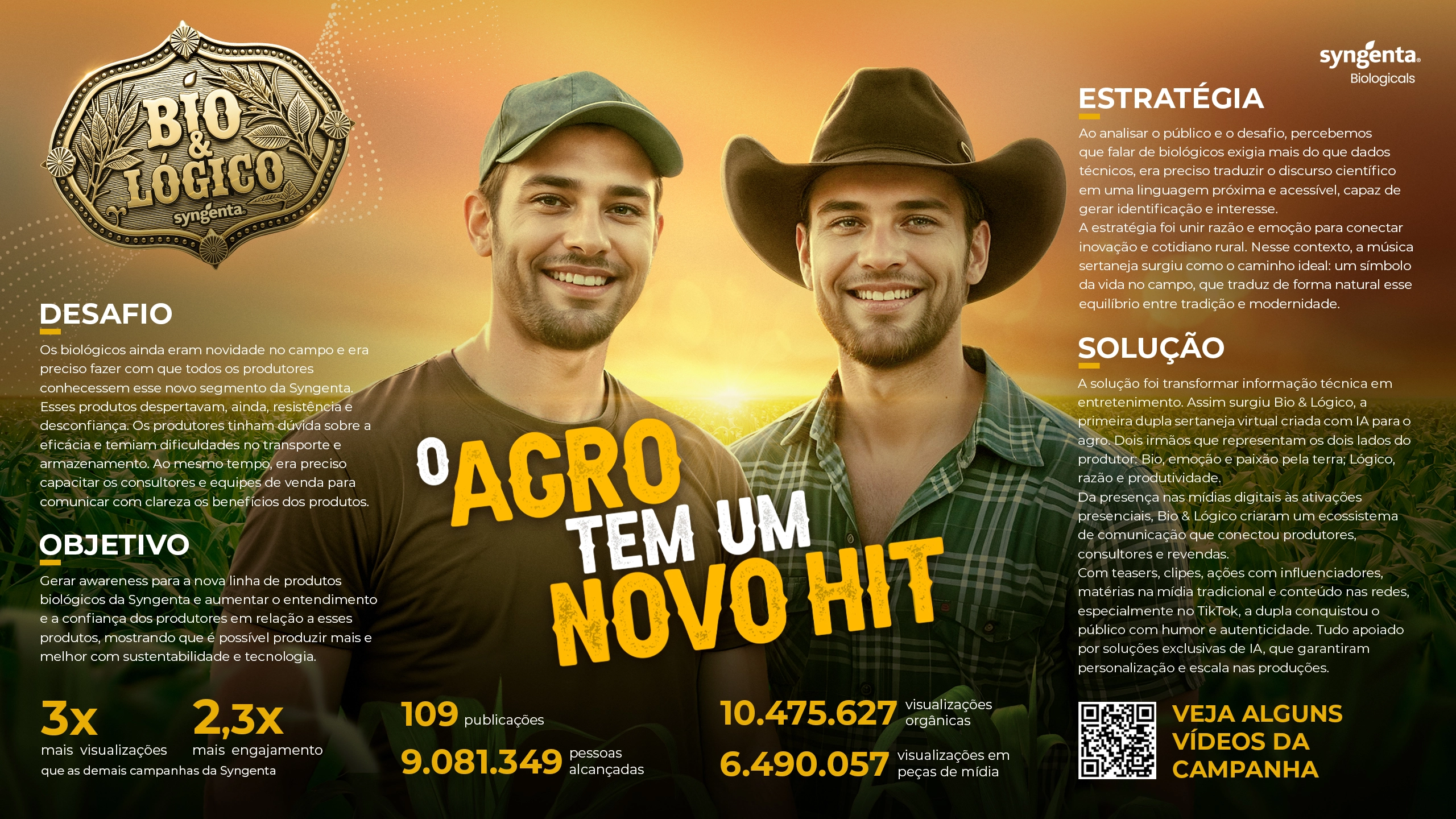 A campanha Bio&Lógico teve como principal objetivo gerar awareness para a nova linha de produtos biológicos da Syngenta, ampliando o entendimento e a confiança dos produtores rurais em relação a esse segmento, ainda recente no mercado agrícola.