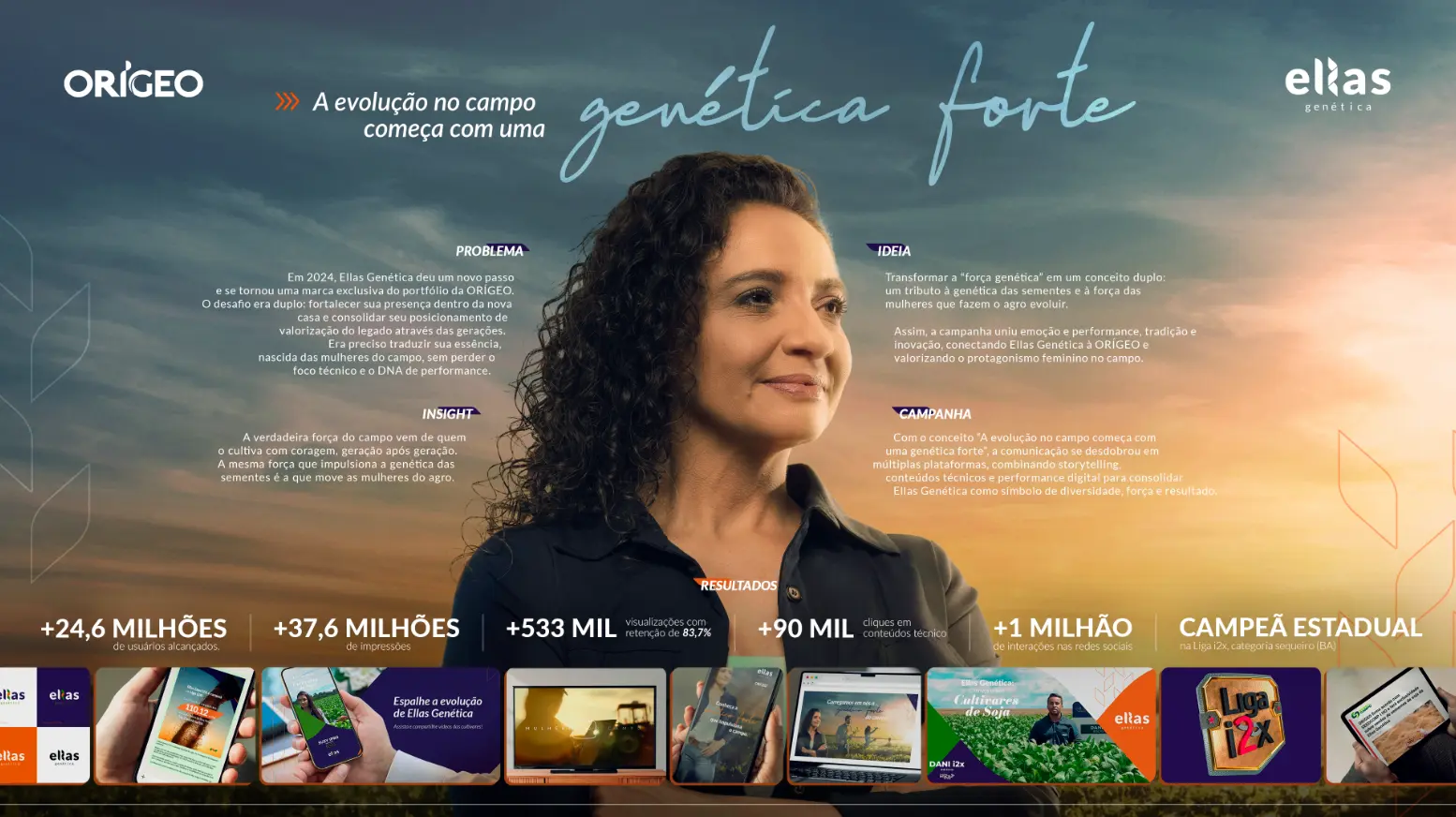 Os resultados superaram todas as expectativas. A campanha alcançou mais de 24,6 milhões de usuários (795% acima da meta inicial), gerou mais de 37,6 milhões de impressões, 90 mil cliques em conteúdos técnicos e mais de 533 mil visualizações em vídeo, com taxa média de retenção de 83,7%. Nas redes sociais, ultrapassou 1 milhão de interações, atingindo taxa de engajamento de 10%. Além dos resultados de comunicação, a Ellas Genética conquistou reconhecimento em campo: foi campeã estadual na categoria de sequeiro na Bahia. Mais do que métricas, a campanha consolidou Ellas como uma marca de propósito, diversidade e resultado, transformando a força feminina em símbolo de evolução no agro.