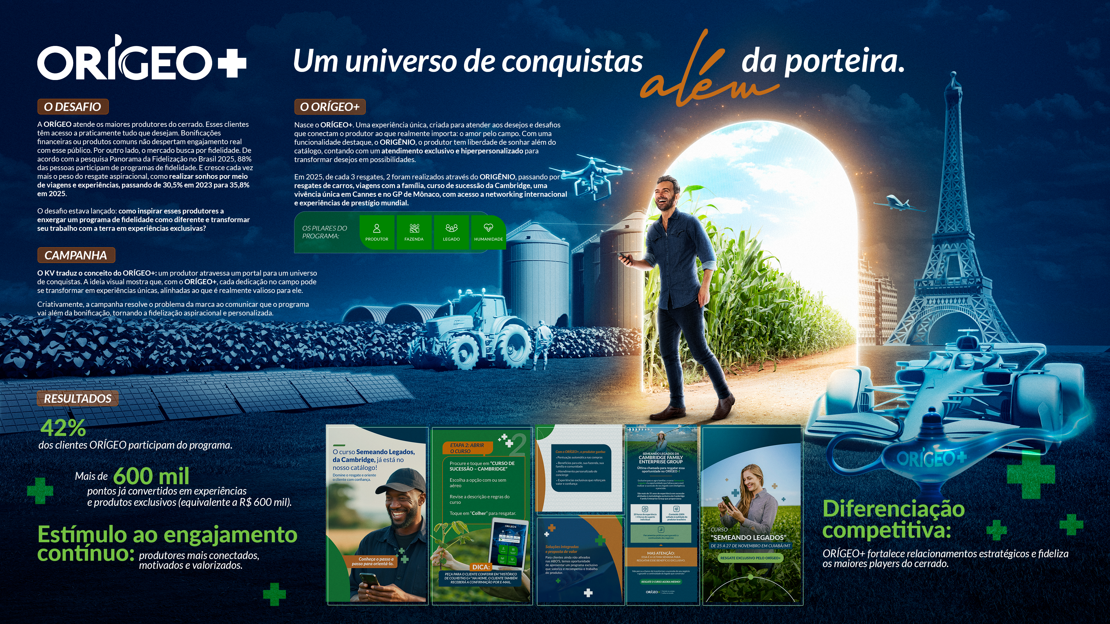 estratégia nasceu do elemento mais presente na vida do produtor: o horizonte — um mesmo ponto para todos, mas visto de forma única em cada fazenda. A partir dessa perspectiva, posicionamos a ORÍGEO como a marca que caminha ao lado do produtor em toda a jornada, conectando soluções integradas “de ponta a ponta” de forma clara e humana. Assim, unimos performance técnica e proximidade, traduzindo complexidade em histórias, relações e experiências que fortalecem confiança e parceria no campo.