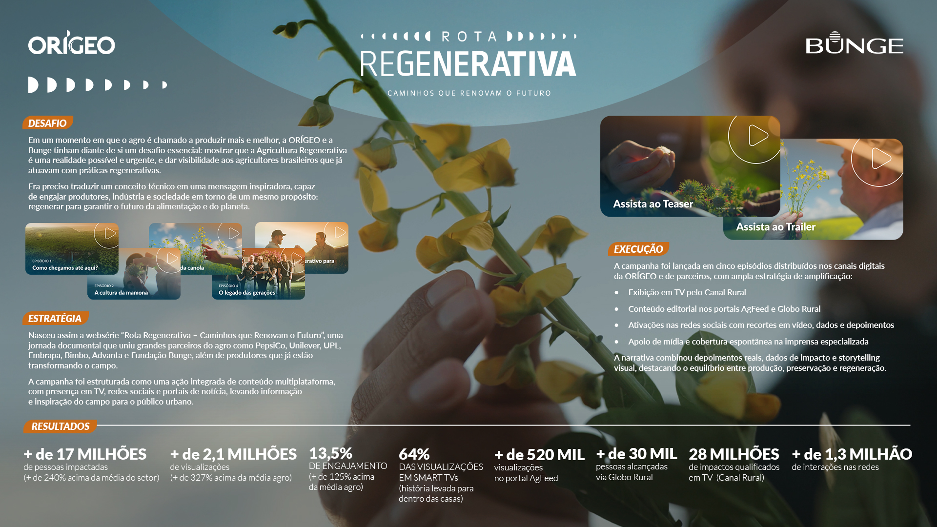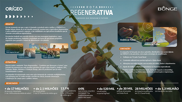 Para inspirar essa transformação, nasceu a websérie Rota Regenerativa: Caminhos que Renovam o Futuro, uma produção de cinco episódios que deu voz a produtores e grandes parceiros do agro comprometidos com a sustentabilidade. A série reuniu nomes como PepsiCo, Unilever, UPL, Embrapa, Advanta, Bimbo e Fundação Bunge, em uma narrativa que uniu emoção e conhecimento para traduzir o que é, na prática, a agricultura regenerativa. A campanha foi pensada como uma jornada multiplataforma, com ampla integração entre mídia digital, social e televisiva. Além da presença no ecossistema da ORÍGEO, a iniciativa alcançou o público por meio de TV (Canal Rural), portais de notícias especializados (AgFeed, Globo Rural) e uma forte estratégia de conteúdo nas redes sociais, impulsionando o tema para além do campo e posicionando as marcas como porta-vozes de um movimento que conecta produtividade e preservação.