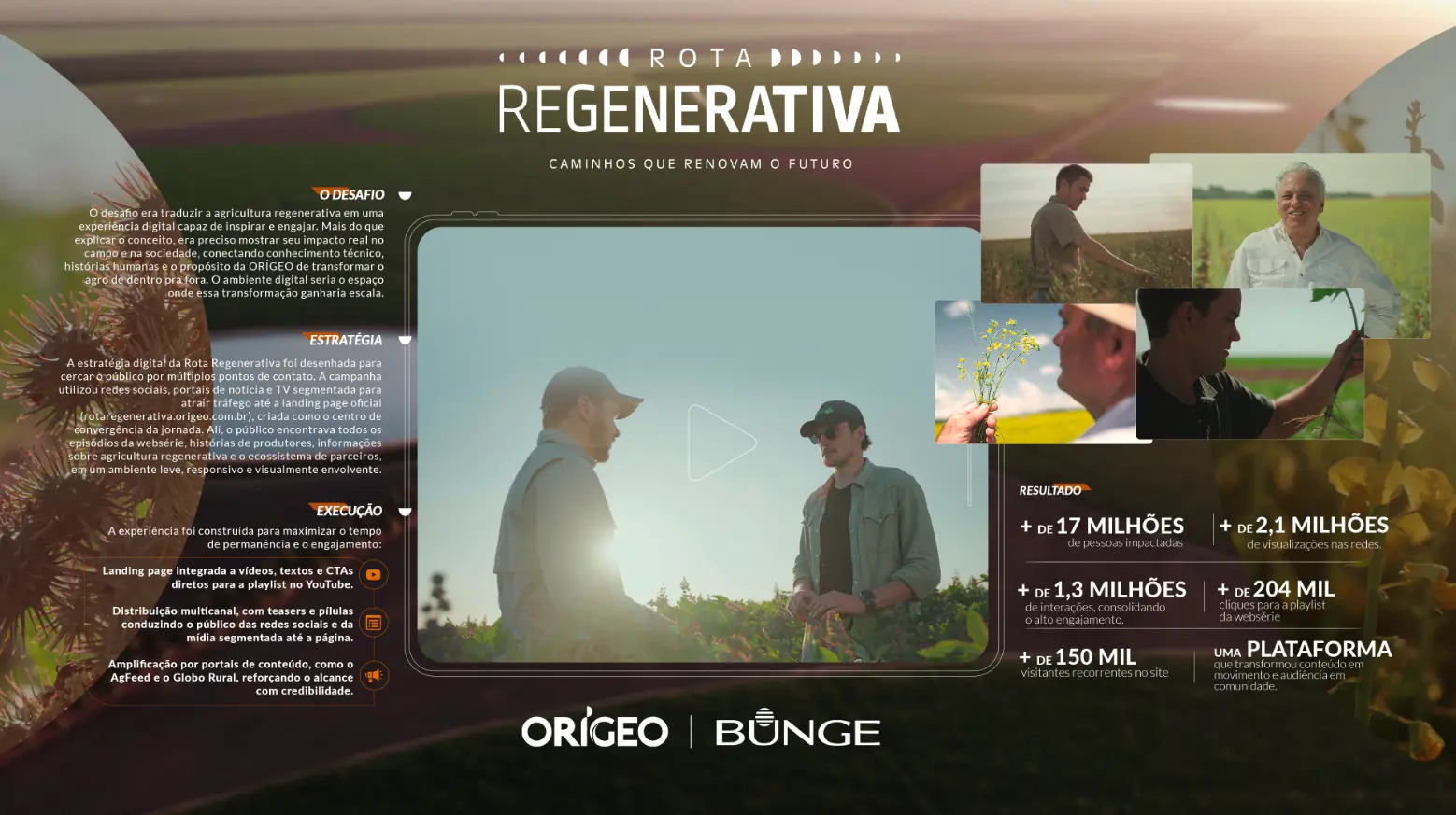 A estratégia foi construir um ecossistema digital completo, com a landing page Rota Regenerativa como elemento chave da jornada: rotaregenerativa.origeo.com.br O site reuniu todos os episódios da websérie, conteúdos educativos e dados sobre o impacto da agricultura regenerativa. Tudo em um ambiente imersivo e interativo. A campanha de mídia digital atuou de forma integrada, cercando o público em diferentes pontos de contato: redes sociais, portais de notícia, plataformas diversas e parceiros estratégicos do agro. O objetivo era não só gerar tráfego qualificado, mas formar uma comunidade digital engajada, que se inspirasse, compartilhasse e se reconhecesse como parte desse movimento.