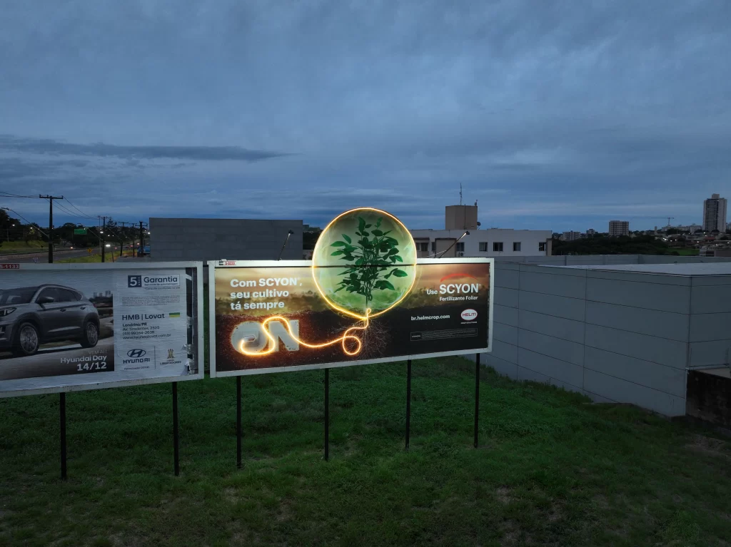 A estratégia desenhada para o produto partiu do próprio nome dele: SCYON. Trabalhamos o fato do ON significar “estar ligado”e transferimos isso para a campnha, sob a forma de iamgens que mostrassem uma planta ligada na terra, ao receber energia. Desta forma, ficou fácil do público entender o prinipal benefício do produto: deixar o cultivar com mais energia sempre. Levamos isso para diferents plataformas, tanto digitais quanto físicas. Inclusive um outdoor que ficava “ligado “noite e dia, próximo à feiras e locais estratégicos para a marca.