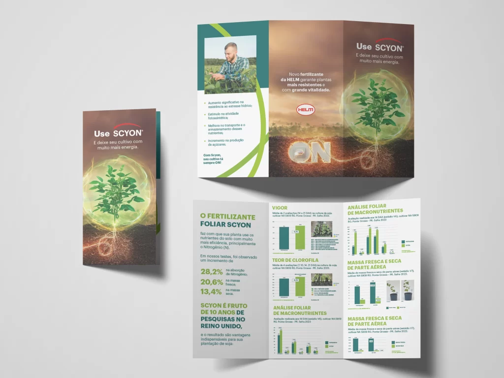 A HELM precisava marcar posição no segmento de fertilizantes. E desenvolveu uma nova tecnologia paea o produto Scyon. Trata-se de um fertilizante foliar que permite que a folha capte mais a luz para a realizar a fotosíntese, indo até as raízes para deixar a planta com mais energia para suportar as intempéries. Como chamar a atenção para este produto, em um mercado dominado por algumas poucas marcas? Como criar algo impactante a ponto do target lembrar do nome e da marca na hora de optar por novas tecologias de fertilização?